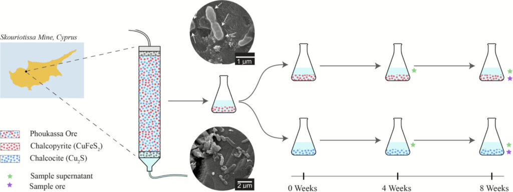 Bioleaching is a microbially mediated green technology for the recovery of metals from ore. Here, microbial consortia from a copper bioleaching column in Cyprus were cultivated on chalcopyrite (CuFeS2) and then sub-cultured on chalcocite (Cu2S) and chalcopyrite to investigate how mineral type and surface chemistry influence microbial community composition.